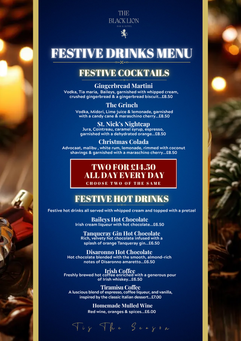 The Black Lion offers a traditional bar where you can catch up with friends, unwind after a hard day’s work or simply find a comfortable spot to indulge in an excellent selection of a great selection of lagers, ales, wines and spirits.