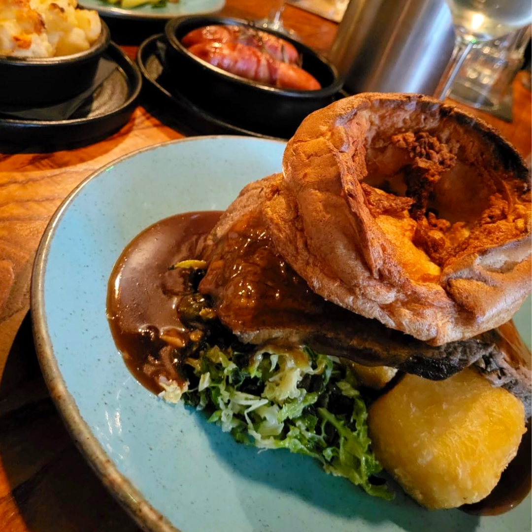Indulge in a delicious Sunday roast with a choice of roast beef or Turkey, served with a giant homemade Yorkshire pudding, rosemary & garlic roast potatoes, stuffing, honey roasted carrots & parsnips, pickled red cabbage, green beans & dipping gravy.